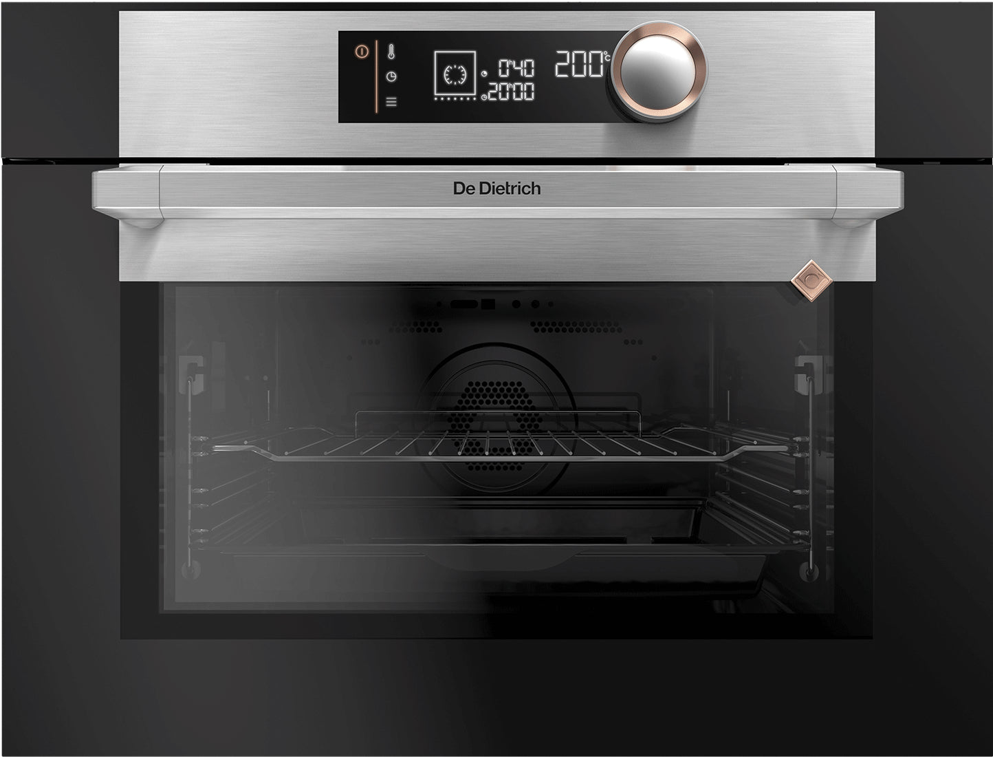 - Panel de control en acero inoxidable y cristal, con mando giratorio y display LED.