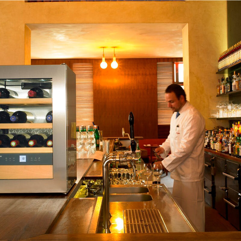 - Puerta de cristal con protección UV para preservar las propiedades del vino.